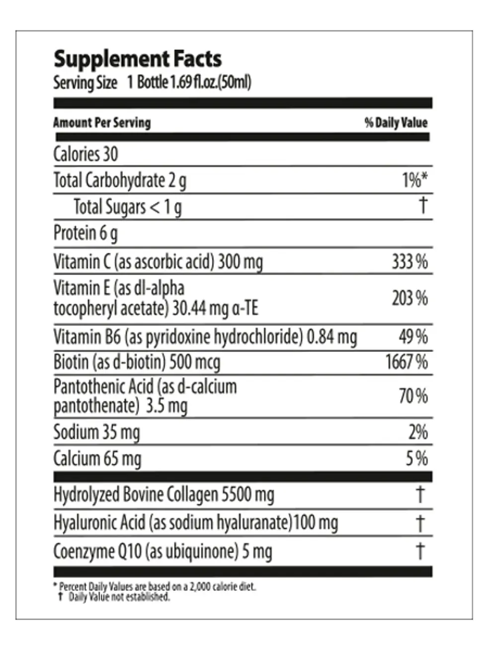 Auxiliary Ingredient: Water, Hydrolyzed Collagen, Acidity Regulator: Citric Acid, Natural Flavoring: Cranberry (Vaccinium macrocarpon Aiton, fruit), L-Ascorbic Acid (Vitamin C), Acidity Regulator: Phosphoric Acid, Beet Root Red Color, Hyaluronic Acid, DL-Alpha Tocopheryl Acetate (Vitamin E), Preservatives: Sodium Benzoate, Potassium Sorbate, Sweetener: Sucralose, Coenzyme Q10, D-Pantothenate Calcium (Vitamin B5), Pyridoxine Hydrochloride (Vitamin B6), D-Biotin